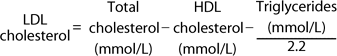 Some authorities use the ratio of the total to HDL cholesterol as an indicator of lipid-related coronary risk: the lower this ratio is, the better. (In the example above, the first person would have a ratio of 275 110 = 2.5, while the second would have a much less favorable ratio of 275 25 = 11.) Although ratios are useful predictors within populations of patients, they may obscure important information in individual patients. (A total cholesterol of 300 mg/dL and an HDL of 60 mg/dL result in the same ratio of 5 as a total cholesterol of 150 mg/ dL with an HDL of 30 mg/dL.) Moreover, errors in the measurement of HDL cholesterol are common in many laboratories, and the total cholesterol-to-HDL cholesterol ratio magnifies their importance.