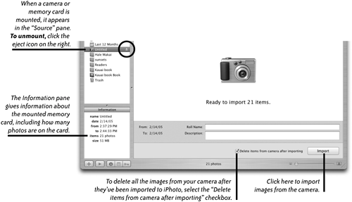 | When a digital camera or a memory card reader is connected to the computer with a USB cable and recognized by iPhoto, the "Import" view button is automatically selected. The next few pages explain how to import your photos directly from a camera, a memory card reader, a CD, or a location on your hard disk. Import photos from a digital camera When you connect a digital camera to your Mac, a disk icon appears on your Desktop named with the brand of memory card that's in the camera.  You can transfer photos directly into iPhoto if your camera has a USB port and if it is compatible with iPhoto. 1. | Turn your camera off.