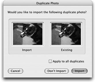 If there are still images left in your camera (or on the camera's memory card) from the last import, iPhoto asks if you want to import the duplicate photos. Select "Applies to all duplicates" to apply your answer ("Import" or "Don't Import") to all duplicates on the card. Otherwise you'll have to click "Import" or "Don't Import" for every duplicate found during the import process.  | If you disconnect a camera or a card reader before you unmount the card, you'll get an error message warning that the device was improperly put away and you may have caused damage to the card. |