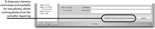 | 4. | To automatically erase the contents of your memory card after importing the photos, select the "Delete items from camera after importing" checkbox.