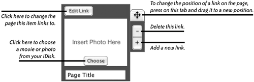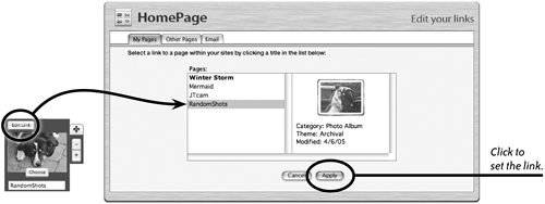 We used the "RandomShots" folder to create a new page (a photo album), and now we're selecting a photo from it to place in the new link as a thumbnail image (below-left). Next, as shown below, we're ready to tell the photo item to link to the new photo album.