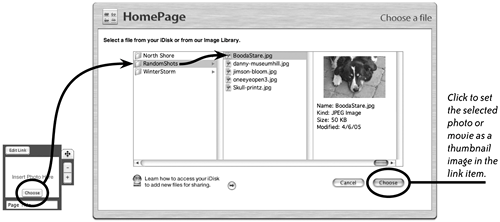 When you click "Choose" on a HomePage template, the "Choose a file" page opens so you can select a photo or a movie to place in the thumbnail area of the link. The left column, above, shows folders of photos that have been copied to the Pictures folder on an iDisk.