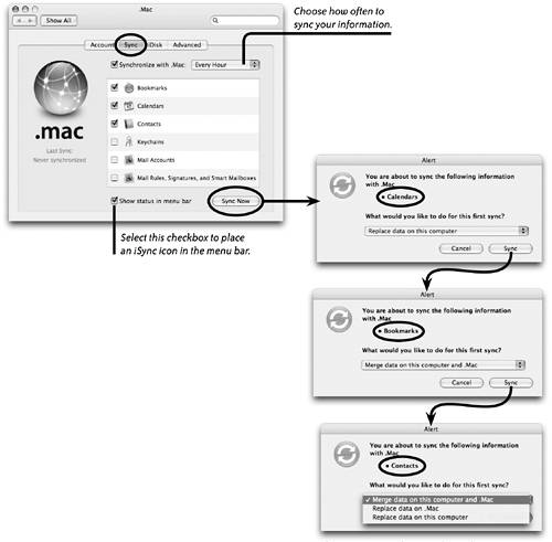 Once you've signed in, your Mac is registered to the .Mac synchronization server. It uses the computer name that you set in the Sharing pane of System Preferences. Information that you choose to sync (see the following page) gets copied to the .Mac server. Then other Macs can sign in and sync to the same server, a procedure called Mac-to-Mac syncing (see page 321).