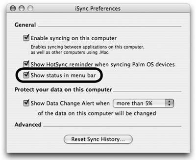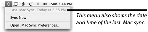 | Show iSync status in the menu bar You can make iSync even more accessible if you put the iSync icon in the menu bar where you can click the icon to open an iSync pop-up menu. To make the iSync icon appear in the menu bar - Click the "Show status in menu bar" checkbox in the iSync pane of .Mac Preferences (circled below-left).