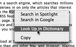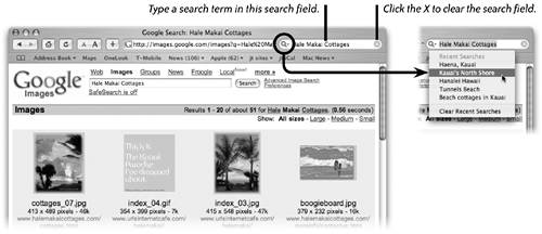 Limit your search for best results Put quotation marks around words that should be searched together, as one term. With quotation marks around a phrase, Google will find only those pages where the words in quotes are next to each other. The image search below found 58 matches without using quotation marks. With quotation marks, Google found 38 matches. Click the magnifying glass icon to open a pop-up menu of recent searches. Choose the last item to "Clear Recent Searches" from the list.  Limit your search even more Use Boolean operators to limit your search. Put a + sign in front of any word or phrase (in quotation marks) that you want to make sure Google finds; put a -- sign in front of any word that you do not want included in the search results. Do not put a space after the + or . A search for safari +browser +apple africa gave "only" 574,000 results. A search for safari gave 33,200,000 results. Safari search tips - Select a word or phrase on any web page, then Control-click on that word. A contextual menu opens with the options to "Search in Spotlight, Search in Google, or Look Up in Dictionary." Spotlight is the powerful new search feature built in to Tiger (Mac OS X v10.4).
