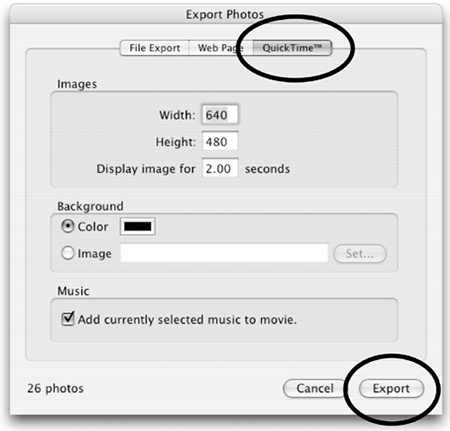 | 3. | In the "Export Photos" window, click the "QuickTime" button.