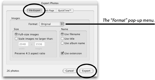 | 4. | From the Format pop-up menu, select a file format in which to save photos: "Original" saves photos in whatever format they currently use. The other options are "JPG," TIF," and "PNG."