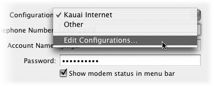 Also see page 35 for important information about dialing modifiers that come in handy if you need to use a calling card number or if you need to get an outside line. And see Chapter 8 for more tips on roaming around the world. Multiple Configurations for Dialing ISPs As we mentioned on the previous page, you can create different configurations for different ISP accounts so you can quickly and easily connect using another ISP. For instance, you might have a dial-up number to use at your sister's house in Alamo, one to get through the motel switchboard in Starkville, and another to use in your London apartment. To create a new modem configuration: 1. | In the Internal Modem pane, click on the "Configuration" pop-up menu, then choose "Edit Configurations...."