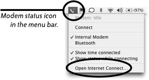 - Or: if you see the modem status icon in the menu bar, from its menu choose "Open Internet Connect..." (circled, below). (If you don't have the modem status icon in your menu bar, see the bottom of the opposite page.)