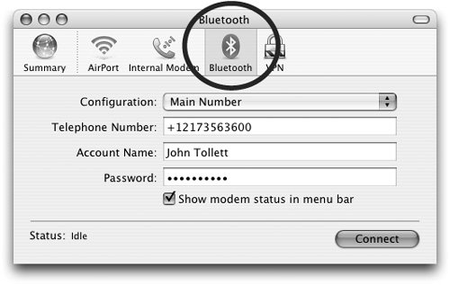 | Bluetooth Preferences Don't forget to peruse the Bluetooth preferences (open System Preferences and click on the Bluetooth icon). If you use a Bluetooth mouse or keyboard with your laptop, you probably want to check the option to allow devices to wake your computer. And if you find that the connection to your keyboard or mouse gets broken every time your start your Mac, check the box to open the Bluetooth Setup Assistant on startup so it will connect them automatically. Set Up a Bluetooth Configuration After pairing a Bluetoothenabled mobile phone with your laptop, as described on the previous page, you can set up a configuration in Internet Connect that allows your mobile phone to act as a modem and connect your laptop to the Internetif your particular mobile phone plan provides Internet connectivity and data communication. If not, you can usually add that service for an additional monthly fee. To set up a Bluetooth modem configuration for your phone: 1. | Make sure "Bluetooth" has been checked on in the Network Port Configurations pane (see page 28).