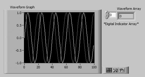 | 2. | Place an array shell (Modern>>Array, Matrix & Cluster palette) in the front panel window. Label the array shell Waveform Array. Place a digital indicator (Numeric palette) inside the Data Object window of the array shell to display the array contents.