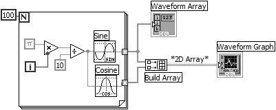 | Figure 8.23. Your VI after adding an additional plot   Build Array Function Build Array function (Programming>>Array palette) creates the proper data structure to plot two arrays on a waveform graph. Enlarge the Build Array function to include two inputs by dragging a corner with the Positioning tool. You will want to make sure you don't select "concatenate inputs" (just use the default value selected in the pop-up menu) to the Build Array so the output will be a 2D array. If you wish to do so, you can review the "concatenate inputs" feature of the Build Array node in Chapter 7.  Cosine Function Cosine function (Mathematics>>Elementary & Special Functions>>Trigonometric Functions palette) computes cos (x) and returns one point of a cosine wave. The VI requires a scalar index input that it expects in radians. In this exercise, the x input changes with each loop iteration and the plotted result is a cosine wave. | | 11. | Switch to the front panel. Run the VI. Notice that the two waveforms both plot on the same waveform graph. The initial X value defaults to 0 and the delta X value defaults to 1 for both data sets.