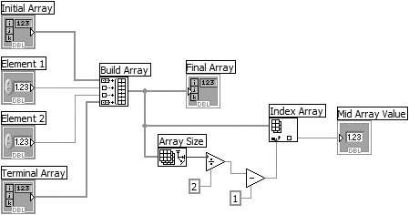 Figure 7.32. Array Exercise.vi block diagram  |  Build Array Function Build Array function (Programming>>Array palette). In this exercise, concatenates the input data to create a new array in the following sequence: Initial Array + Element 1 + Element 2 + Terminal Array.  Build Array Function The function looks like the icon at the left when placed in the diagram window. Place the Positioning tool on the lower-middle edge and resize the function with the resize handles until it includes four inputs.  Array Input  Element Input The inputs will automatically detect whether you are wiring an array or an element. The symbols at the left indicate whether an input is an array or an element.  Array Size Function Array Size function (Programming>>Array palette). Returns the number of elements in the concatenated array.  Index Array Function Index Array function (Programming>>Array palette). In this exercise, returns the element in the middle of the array. LabVIEW builds the array using the Build Array function, and then calculates the index for the middle element of the array by taking the length of the array, dividing it by two, and subtracting one (to account for the zero-based array index). Because the array has an even number of elements, the middle element will actually be one of the two middle elements.