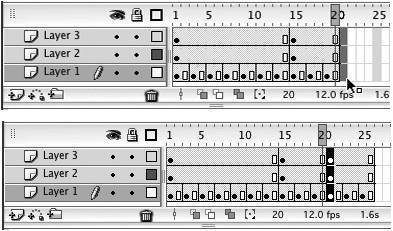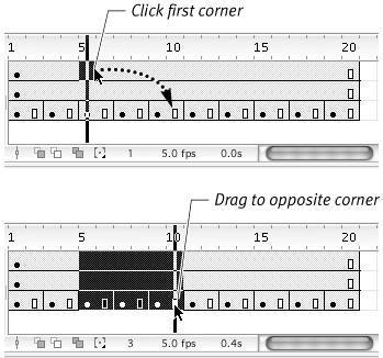 Figure 11.6. In frame-based selection mode, click and drag across frames and layers (top) to select frames in those layers (bottom).  | 3. | Choose Edit > Timeline > Copy Frames.