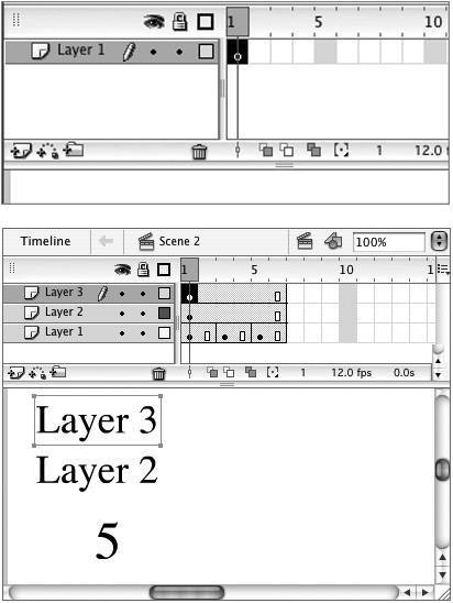 Place content in the layers to help you see what's going on as you work with the various frames and layers. Use the text tool, for example, to place the frame number in every other frame of layer 1 and to place a text block with the name of the layer in layers 2 and 3.