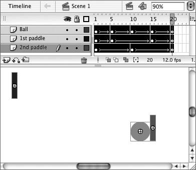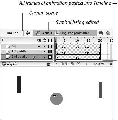 Flash pastes the 20 frames and 3 layers that you copied from the original Ping-Pong movie into the Timeline for the Ping-PongAnimation symbol (Figure 11.30). If you want to make any adjustments in the animation sequence, you can do so at this point.