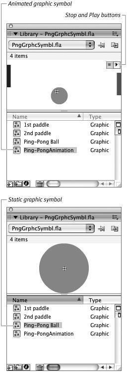 Tips In the list of symbols in the Library panel, an animated graphic symbol looks the same as a static graphic symbol; both have the same icon, and both are listed as Graphic in the Type column. An animated graphic symbol, however, has Play and Stop buttons in the top-right corner of the preview window; a static graphic symbol doesn't (Figure 11.31). You can preview an animated symbol by clicking the Play button. Figure 11.31. An animated graphic symbol (top) in the Library panel has Stop and Play buttons as part of its preview; otherwise, it's indistinguishable from a static graphic symbol (bottom).  When you paste multiple frames and layers into the Timeline in symbol-editing mode, the registration crosshair may be in a strange position for the symbol as a whole. To reposition the items making up the symbol, in the Status bar, click the Edit Multiple Frames button; from the Modify Onion Markers pop-up menu, choose Onion All; finally, choose Edit > Select All to select the contents of each keyframe in each layer. Now you can position the symbol as a whole in relation to the crosshair. How Do Animated Graphic Symbols Differ from Movie-Clip Symbols? Flash provides for two kinds of animated symbols: graphic symbols and movie clips. The difference is a bit subtle and hard to grasp at first. An animated graphic symbol is tied to the Timeline of any movie in which you place the symbol, whereas a movie-clip symbol runs on its own independent Timeline. When the playhead stops moving in the main Timeline, an animated graphic symbol stops playing, but a movie-clip symbol continues to play. Think of the frames of an animated graphic symbol as a tray of slides and a movie-clip symbol as a film loop. The animated graphic symbol projects its slides, one per frame, in lock step with the frames of its hosting movie: to see the next frame of the symbol, you move to the next frame in the hosting movie. Like a tray of slides, an animated graphic symbol has no sound track. If you have sounds in a movie and you convert that movie to a graphic symbol, you lose those sounds. If you have attached ActionScript to buttons, that interactivity survives the conversion to a graphic symbol (though any actions that control the Timeline affect the Timeline of the hosting movie, not the graphic symbol itself, potentially creating confusion). Other types of interactivity do not survive the conversion. A movie-clip symbol can project all its frames one after another, over and over, in a single frame of the hosting movie. Movie clips do have a sound track and do retain their interactivity. (To learn more about sound, see Chapter 15. For interactivity, see Chapters 12 and 13.) One more thing to know about the two symbol types is that movie clips, because they run on their own Timeline, don't appear as animations in the Flash authoring environment. You see only the first frame of the movie as a static element on the Stage. Animated graphic symbols, which use the same Timeline as the main movie, display their animation in the authoring environment. |