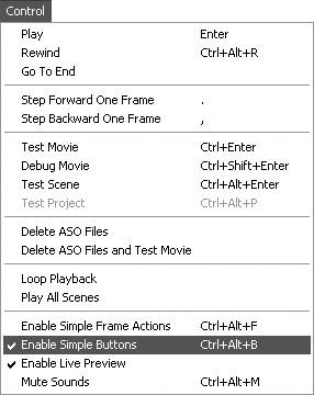 Figure 13.22. To make button symbols active, so that you see their Up, Over, and Down states in the authoring environment, choose Control > Enable Simple Buttons. (This command has no effect on button components.) To further enable them to carry out simple ActionScript tasks, choose Control > Enable Simple Frame Actions.  Now when you position the pointer over a button object on the Stage, you see its Over frame; when you click the button, you see its Down frame.