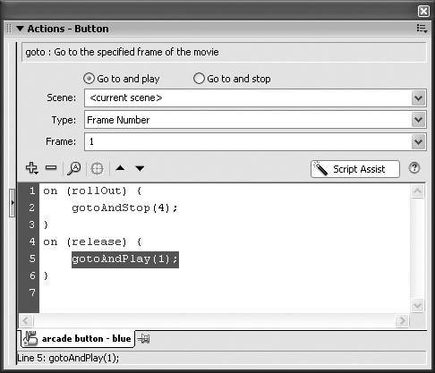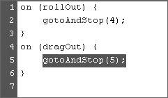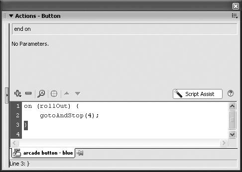 Figure 13.37. In Script Assist mode, selecting the event handler line in the script gives you access to other events. Deselect the default Release and select the Roll Out check box to make the button respond to a user's rolling out of the button area.  | 7. | In the Script pane, click line 3.