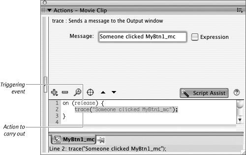 Figure 13.49. Flash carries out the action(s) that appear between the curly braces when the triggering event takes place. The trace action can stand in for as yet unspecified actions to speed testing as you develop movie-clip buttons.  | 7. | Choose Control > Test Movie to try out the first phase of your button-style movie clip.