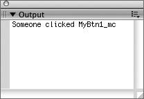 Figure 13.50. During playback, when the pointer is outside the graphic area of the movie-clip button that has an on () handler (top), Flash displays the symbol's _up frame and the pointer is an arrow. Upon entering the graphic area of the movie clip (bottom), the pointer changes to a pointing hand, and Flash displays the symbol's _over frame.  Figure 13.51. Each time you click the movie-clip button, Flash enters the trace message in the Output panel. If the panel is closed or hidden behind other windows, Flash opens it or brings it forward.  | 8. | Save this file for use in the following task: name it ScriptAClipBtn.fla.