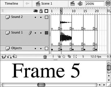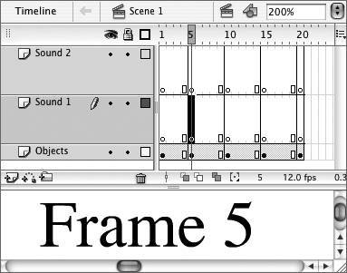 Figure 15.16. To make two different sounds begin playing simultaneously, you must put each sound in a different layer in a keyframe at the same spot in the Timelinefor example, keyframe 5.  | 7. | In the Frame Properties tab of the Property inspector, from the Sync pop-up menu, choose Event.