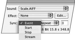 Figure 15.13. In the Frame Properties tab of the Property inspector, choose a sound from the Sound pop-up menu.  | 4. | From the Sync pop-up menu, choose Event (Figure 15.14).