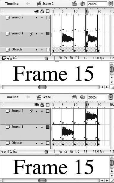 Figure 15.15. You can add a second instance of your sound and make it play on top of the first. Event sounds play independent of the main Timeline, so you're free to add the second sound to the same layer as the first (top). Alternatively, you can add the second sound to its own layer (bottom).  | 4. | Position the playhead in keyframe 1, and play your movie one time.