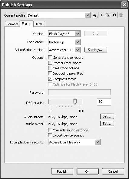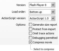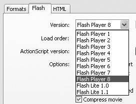 | To choose a Flash Player version From the Version pop-up menu, choose a version of Flash Player (Figure 16.16). Figure 16.16. Choose a version of Flash Player to publish to. Publishing to earlier versions makes some features of Flash 8 unavailable but ensures that a wider audience will have the correct player. Users of Flash Professional 8 (shown here) can also choose a Flash Lite version.  Your options are Flash Player 1 (formerly known as FutureSplash Animator) through 8. (Flash Professional 8 users can also choose to publish to Flash Lite 1.0 and 1.1: players that work in devices such as mobile phones.) If you publish your file as a version earlier than Flash Player 8, you lose some features specific to Flash 8. Tips Before you start creating ActionScripts, set the Flash export options in the Publish Settings dialog to the earliest version of Flash Player to which you plan to export. Any Flash 8 actions that won't work in that version appear with yellow highlighting in the Actions Toolbox in the Actions panel. When you choose Flash Player 6 from the Version pop-up menu, the Optimize for Flash Player 6 r65 check box becomes active. Select the check box to enable Flash to take advantage of performance improvements made to Flash Player 6 (these enhancements appear in release 65 and later of Flash Player 6). To control how Flash draws the movie's frames From the Load Order pop-up menu, choose the order in which Flash loads a movie's layers for display (Figure 16.17). Figure 16.17. The Load Order pop-up menu determines the order in which Flash draws the layers of the frames of your movie.  When playback over the Web is slow, Flash starts displaying individual layers as they download. The Top Down setting tells Flash to send (and display) the top layer first and then work its way to the bottom layer. Bottom Up does just the opposite. To choose the version of ActionScript used (Flash Player 68) From the pop-up menu, choose ActionScript version.1. 0 or ActionScript version 2.0 (Figure 16.18). Figure 16.18. ActionScript 2.0 presents special tasks for the compiler when Flash publishes a SWF file. Be sure to select it if you use version 2.0 for scripting.  This setting tells Flash which version of the scripting language you've used in scripts in your document so the compiler treats the code appropriately. The menu becomes active only when you've chosen Player versions 68. Tip To list the amount of data in the movie by frame Select the Generate Size Report check box (Figure 16.19). Figure 16.19. Choose Generate Size Report (top) to have Flash create a text file that lists the amount of data in your movie (bottom). Flash creates a separate text file listing the frames of the movie and how much data each frame contains. (The Size report text also appears in the Output panel.) This report helps you find frames that bog down the movie's playback. You can then optimize or eliminate some of the content in those frames. Tip To protect your work Tip To set trace and debug options To tell Flash how to deal with trace actions and debugging (options that are useful for more advanced ActionScripters), select either of the following check boxes: Omit trace actions prevents trace actions from appearing in the Output window during debugging. This option strips the trace actions from the published movie, allowing you to view only non-trace debugging items in the Output window. Omitting trace actions also reduces file size slightly if your scripts contain lots of trace actions. Debugging permitted allows remote debugging of ActionScripts. This option allows you or other users to debug a Flash Player (SWF) file as it plays over the Internet. Tip To compress the SWF file (Flash Player 68) 1. | Choose Flash Player 68 from the Version pop-up menu.