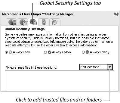 A Note about Flash Player 8's Security Settings Flash 8 and Flash Player 8 allow you to create Flash content that uploads and/or downloads files at runtime; this capability gives Flash more power than in previous versions, but with that power comes the potential to do harm. A new security feature ensures that SWF files can't perform malicious deeds on the systems of your target audience. Flash's default local-security settings prohibit SWF files running locally (on a single computer) from communicating with files being served on the Internet (and vice versa); to allow such communication, you must give Flash Player specific permissions. If you test a movie published to Flash 8 locally, before deploying it to a server, and you use a button or link in the movie to connect to the Internet, you may receive a warning that Flash Player has stopped an operation that might be unsafe. If the file you're testing doesn't need to communicate with both the local system and the Internet, you can solve the problem by changing your Publish Settings. (In the Flash section of the Publish Settings dialog, under Local Playback Security, choose Access Network Only.) If, after changing the Local Playback Security setting, you still get the warning, you need to give your SWF file special permission to communicate with the Internet. When the Macromedia Flash Player Security dialog appears (Figure 16.27), click the Settings button. Flash opens a browser window and directs you to a page of the Flash Player documentation on the Macromedia site (http://www.macromedia.com/support/documentation/en/flashplayer/help/settings_manager04a.html). This page gives you access to the Settings Manager (Figure 16.28). Figure 16.27. When a SWF file on a local computer attempts to access a file on the Internet, Flash Player 8 won't allow it to, unless you've set the proper security settings. You'll see a warning dialog to alert you to the fact that your settings don't allow this communication. Figure 16.28. The Global Security Settings tab of Macromedia Flash Player Settings Manager lets you create a list of trusted files and/or folders for Flash Player 8 security. Any SWF files in locations covered by this list can communicate with Internet files.  Use the Global Security Settings tab of the manager to create a list of trusted items. Flash Player always allows SWF files from the Global Security Settings list to communicate with the Internet, even though they're being run locally. Use the Edit Locations pop-up menu to add individual SWF files or folders to the trusted list or remove them from the list (Figure 16.29). Figure 16.29. Click the Edit Locations pop-up menu to manage a list of trusted files (top). Click Add Location to open a window (middle) where you can add a new file or folder to a Trusted list. If you opened the Global Security Settings Manager by clicking the Settings button of the security warning dialog (Figure 16.27), the window's Tip field shows the path name for the file you were working on. Copy and paste that name to the Trusted field (or use one of the Browse buttons to navigate to the file or folder you want to add); click Confirm to add the trusted file to the Trust list (bottom). If you'll be doing lots of this type of testing, it makes sense to set up a special trusted folder where you keep only your own SWF files you need to test. Don't allow Flash Player to trust folders on your system that might include SWF files downloaded from other sources. Such files have the potential to do something dangerous, such as copying information from your system and sending it to an outside location. |