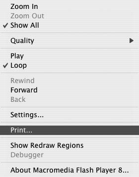 Figure 16.68. In your browser, Control-click (Mac) or right-click (Windows) to access Flash Player's contextual menu. Choosing Print outputs all the pages defined as printable.  | 11. | Choose Print.