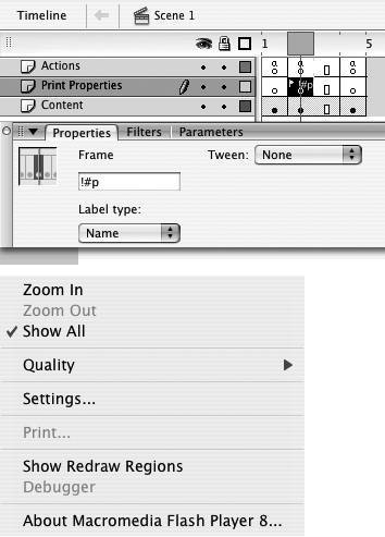 Figure 16.69. Attaching the label !#p to any frame in a movie (top) grays out the Print option in the contextual menu of Flash Player (bottom).  | Tip |