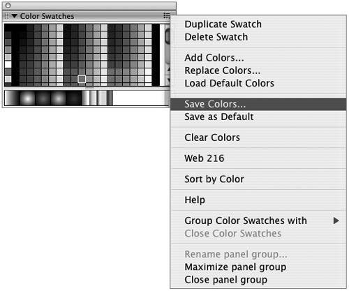 Figure 2.14. The Options menu in the Color Swatches panel offers commands for working with color sets.  The Export Color Swatch dialog appears (Figure 2.15).