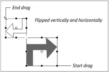 Figure 4.26. The results of flipping an element by using the Flip commands in the Modify > Transform submenu.  | Tip You can flip and scale elements simultaneously by using the free-transform tool's Scale modifier. With the selected element in Scale mode, drag one handle all the way across the bounding box and past the handle on the other side. To flip a selected element vertically and horizontally, for example, drag the handle in the bottom-right corner diagonally upward, past the handle in the top-left corner (Figure 4.27). The flipped element starts small and grows as you continue to drag away from the element's top-left corner. Flash previews the flipped element; release the mouse button when the element is the size you want. Figure 4.27. The free-transform tool's Scale modifier can flip and scale an element simultaneously. Here, the Scale modifier is flipping the element both vertically and horizontally.  To rotate an element in 90-degree increments 1. | Select the element you want to rotate.