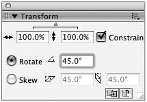 Figure 4.28. The Transform panel lets you rotate graphic elements in precise increments. Positive values rotate the element clockwise; negative values rotate it counterclockwise.  If the panel isn't open, choose Window > Transform.
