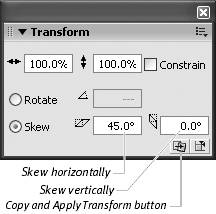 Figure 4.29. Use the Transform panel to skew selected elements. You can set separate values for horizontal and vertical skewing.  | 4. | To complete the transformation, press Enter.