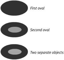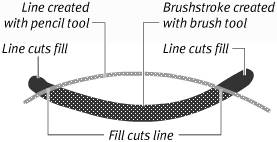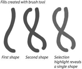 When Merge-Shapes Interact You can think of each frame in a Flash movie as being a stack of transparent acetate sheets. In Flash terms, each sheet is a layer. Graphics on different layers have a depth relationship: Items on higher layers block your view of items on lower layers, just as a drawing on the top sheet of acetate would obscure drawings on lower sheets. Imagine that you have two layers in your movie. If you draw a little yellow square on the bottom layer and then switch to the top layer and draw a big red square directly over the yellow one, the little square remains intact, but you can't see it. The square on the top layer is in the way. On a single layer in Flash, however, merge-shapes interact with one another, almost as though you were painting with wet finger paint. Here's a quick run down of how lines (strokes) and shapes (fills) created in Merge Drawing mode interact within a single layer. When Merge-Shape Lines Intersect Intersecting merge-shape lines drawn on the same layer affect one another. Draw one line in Merge Drawing mode, and then draw a second line that intersects the first. The second line cutsor, in Flash terminology, segmentsthe first. Segmentation happens whether the lines are the same color or different colors, but it's easiest to see with contrasting colors (Figure 5.1). Figure 5.1. When you draw one line across another in Merge Drawing mode, every intersection creates a separate segment.  You might expect that the second line you drew would wind up on top of the first, but sometimes, that's not the case. Start with a red line, and then draw a blue line across it; the blue line jumps behind the red one when you release the mouse button. Flash creates a stacking order for merge-shape lines based on the hex-color value of the line's stroke-color setting. The higher the hex value of the stroke color, the higher the line sits in a stack of merge-shape lines drawn on the Stage. A merge-shape line whose stroke color is set to a hex value of 663399 always winds up on top of one whose stroke color is set to 333399. When Merge-Shape Lines and Fills Intersect Even the invisible outlines that describe painted brush-stroke fills can cut other lines when they're created in Merge Drawing mode. When you draw merge-shape lines over merge-shape fills, you can wind up with lots of little segments. Try drawing lines with the pencil tool and shapes with the brush tool set to Merge Drawing mode. If you paint a brush stroke that intersects a line, the brush stroke remains one solid object, but the line gets segmented (Figure 5.2). If you draw a line that intersects a brush stroke, the line cuts the brush stroke, and the invisible outline of the brush stroke cuts the line (Figure 5.3). Figure 5.2. When a merge-shape fill overlays a merge-shape line, the fill segments the line. As the selection highlighting shows, the fill remains one solid object.  Figure 5.3. When a merge-shape line overlays a merge-shape fill, the line cuts the fill, and the fill's invisible outline cuts the line.  When Merge-Shape Fills Intersect When intersecting fills created in Merge Drawing mode are the same color, the newer fill adds to the merge-shape (Figure 5.4). Figure 5.4. When you draw overlapping fills in the same color in Merge Drawing mode, Flash puts the two shapes together to create a single merge-shape.  When fills of different colors interact, the newer fill replaces the older one (Figure 5.5). If the new fill only intersects the old, it still replaces the part where the two overlap. Figure 5.5. When one merge-shape fill overlaps another of a different color, the fills don't meld but remain separate. The second oval here replaces the first where they overlap.  |