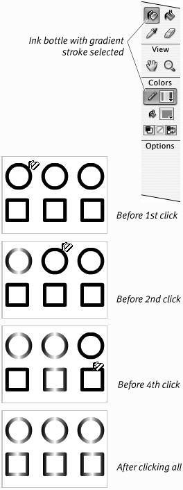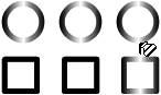Figure 5.33. When strokes are selected on the Stage and you choose a gradient for the stroke attribute, Flash applies separate gradients to each drawing-object stroke (the circles) and a single underlying gradient to all the selected merge-shape strokes (the squares).  | Tips If you follow the steps of the previous task, but use drawing-object strokes, Flash centers a separate gradient within each drawing-object stroke. If you use the ink bottle to directly click any of the selected merge-shape strokes, Flash applies a single underlying gradient, centering it within the shape you clicked and using the current overflow setting (see Chapter 4) to extend the gradient to the other selected shapes (Figure 5.34). Figure 5.34. When you use the ink bottle to click any stroke in a selection that includes multiple merge-shape strokes, Flash applies an underlying gradient again. This time it's centered in the merge-shape you click and overflows to the other merge-shapes.  To modify gradients underlying multiple merge-shapes 1. | Follow the steps in the preceding tasks to create a gradient that underlies several merge-shape strokes or fills.