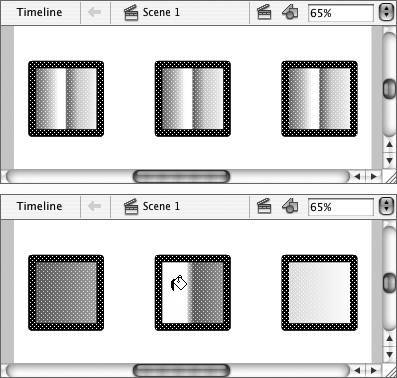 Figure 5.32. When you choose a gradient fill with several merge-shapes selected, Flash first applies separate gradients to each shape (top). When you then click one of the selected fills directly with the paint-bucket tool (and Lock Fills deselcted), Flash spreads the gradient across all the fills. For linear gradients, the center of the gradient is at the center of the selected shapes; for radial gradients, where you click becomes the center of the gradient.  | Tips Moving one of the shapes in the task above disconnects the shape's fill from the underlying gradient. The shape still shows the same slice of the gradient, but in fact the moved shape contains a separate copy of the gradient fill. If you select Lock Fill in step 4, Flash again spreads one gradient across all your merge-shapes, but this time Flash centers the underlying gradient at the left edge of the Stage. You can verify the location by clicking one of the shapes with the gradient-transform tool (see "To modify gradients underlying multiple merge-shapes," later in this chapter). Because drawing-objects are separate containers, you can't create a single underlying gradient for multiple drawing-object fills. You can fake the appearance of doing so, however, by using the technique in the previous tip but using drawing-object fills. To spread one gradient across multiple merge-shape strokes 1. | On the Stage, create an object made of several merge-shape strokes.