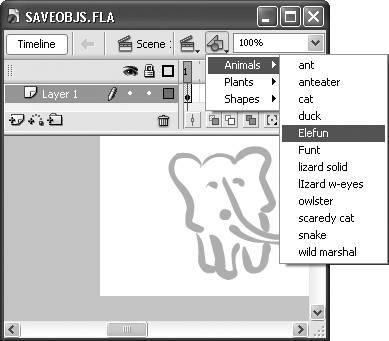 Figure 7.30. Choosing a symbol from the Edit Symbol pop-up menu in the Edit Bar takes you into symbol-editing mode.  Flash opens the symbol editor in the current window.