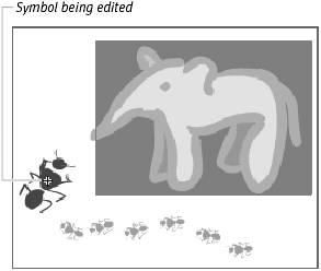 | After you create a symbol, you can refine and modify it in symbol-editing mode. Unlike modifications of a symbol instance, which affect just that instance on the Stage, leaving the master symbol in the library unchanged, modifications made in symbol-editing mode affect the master symbol and all instances of that symbol in your movie. You can enter symbol-editing mode in several ways. To enter symbol-editing mode from the Stage 1. | On the Stage, select the symbol you want to edit.