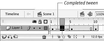 Flash defines frames 14 as a motion tween, updating the Timeline to give you information about the tween (see the sidebar "Which Frames Contain Tweening?") (Figure 9.3). These in-between frames no longer display the content of the preceding keyframe, instead they display the incrementally changed content that Flash creates. This tween content is shielded so you can't select it (clicking a graphic-object on an in-between frame set to tween is just like clicking a blank area of the Stage). You can, however, drag tween content, but doing so transforms the in-between frame into a keyframe.