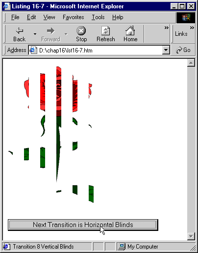 Code Listing 16-7 allows the user to cycle through all 24 reveal transition effects by clicking a button at the bottom of the page. Figure 16-6 below shows one of the transitions in progress.