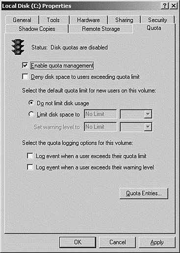 Objective: Monitor file and print servers. Tools might include Task Manager, Event Viewer, and System Monitor. Disk quotas are a method of controlling the amount of space a user has access to on a file server. You can also use the Disk Quota feature to monitor the space in use by your users. As we mentioned earlier, both the Windows 2000 and Windows Server 2003 operating systems support disk quotas, which are used to track and control disk usage per user on NTFS volumes. Quotas can be configured in one of two ways: as a monitoring tool so that the administrator can track disk usage by user or as a tool to prevent the user from saving files to the disk when a specified limit is reached. There are two types of disk quotas in Windows Server 2003 starting with the release of version R2: NTFS Quotas NTFS quotas are set on a per-volume basis and are assigned to each user, but unfortunately they cannot be assigned by folder or by group. Similar to encryption and compression, quotas can be used only on NTFS-formatted partitions and volumes. When you enable disk quotas for a volume, volume usage is automatically tracked for all users from that point on. NTFS quotas have the following features and limitations: Disk quotas do not apply to members of the local Administrators account. The files contained on a volume converted from FAT to NTFS do not count against user quotas, because they are initially owned by the local administrator. Files created or moved to the volume after the conversion has been completed are owned by the user. Disk quotas cannot be applied on a per-folder basis. They can only be applied per volume. If a physical disk has multiple volumes, a quota can be applied separately to each volume. Even if a volume consists of multiple physical disks, the quota for the volume applies to the entire volume. Disk usage is based on all files that the user creates, copies, or takes ownership of. File compression cannot be used to prevent users from exceeding their quota. Disk quotas are based on the actual file size, not the compressed file size. Disk quotas affect the free size that an installed application sees during the installation process. Disk quotas can be enabled on local or network volumes and removable drives formatted with NTFS. Disk quotas are not available on any volume or partition formatted using a version of Windows prior to Windows 2000. Disk quotas are available only on NTFS volumes or partitions formatted by Windows 2000 or later. When quotas are exceeded, notification is via an entry in the event logs. Implementing NTFS Disk Quotas Exam Alert: Which Disk Quotas? We are presenting material on the older NTFS Quotas because questions pertaining to them might appear on the exam, and your environment might include pre-R2 versions of Windows Server 2003. However, if you are using a Windows Server 2003 R2 server, you should use the new style quotas implemented via the FSRM. NTFS Quotas are applied at the volume level from the Volume Properties dialog box of the NTFS volume. In addition to turning quotas on or off, the following options are available on the Quota Properties tab: Deny Disk Space to Users Exceeding Quota Limit This option causes users who have exceeded their limit to receive an "insufficient disk space" message when they try to save a file. They will be unable to add any more data to the volume until they free up space by moving or deleting some existing files. Limit Disk Space To This setting is used to configure the amount of space to which new users are limited. Log Event When a User Exceeds Their Quota Limit When a user exceeds his or her quota, an event is written to the System log. These events are queued and written hourly. Log Event When a User Exceeds Their Warning Level When a user exceeds his or her warning level, an event is written to the System log. These events are queued and written hourly. The default in Windows Server 2003 is for quotas to be turned off. To set NTFS quota limits on a volume, perform the procedure outlined in Step by Step 13.7. Step by Step 13.7 Setting NTFS Quota Limits on a volume 1. | From My Computer or Windows Explorer, right-click the volume you want to enable quotas on and select Properties from the pop-up menu.