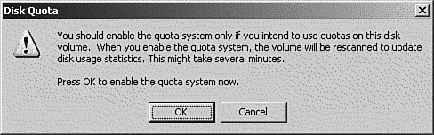 Figure 13.15. This warning dialog box tells you that the drive will be scanned so that the file ownership can be inventoried and the disk usage can be credited to each user.  | | After you turn on disk quotas, the volume is scanned and the file space is calculated, depending on the Creator Owner of each file. Although all users are assigned, by default, the quota limit you just configured (see Figure 13.16), you can change the quota configuration of an existing user. Figure 13.16. The Quota Entries window from a drive that just had quotas enabled. Note that there is no limit on the administrators account. Managing NTFS Disk Quotas After disk quotas have been implemented on your server, most of the work required in managing them involves monitoring the disk space that the users have allocated and making adjustments when a user has a good reason to receive more disk space. A lot of this monitoring can be performed from Event Viewer if you selected the option to write an entry in the event logs when a user crosses the warning threshold or exceeds the hard limit. The applicable entries in the event logs can be found by performing a search or filtering for the event IDs 36 (for warning threshold) and 37 (for over the limit), with a source entry of NTFS. Quotas can be configured so that when users reach a preset warning level, an event is recorded in the event log. The users can continue to save files to the volume until they reach their quota limit. At that time, they will be unable to save any more files to the volume, and they will receive an "insufficient disk space" message. This will also record an event in the event log. The second major task associated with disk quotas involves monitoring the space each user has available. This can be accomplished by opening the Quota Entries window and sorting the space entries to find out which users have exceeded their limits and which users are near their limits, as shown previously in Figure 13.16. This is made easier by referring to the icons to the left of the entries. The following icons are used so that you can see the status at a glance: Green This means the user is below the warning threshold. Yellow triangle with exclamation point This means the user is over the warning threshold but under the limit. Red circle with exclamation point The user has exceeded the limit. File Server Resource Manager Quotas Although NTFS Quotas are still available in Windows Server 2003 R2, it's much better to implement your quotas using the File Server Resource Manager (FSRM). The differences are as follows: Quotas can be set at both the folder and volume level. Quotas are calculated using the actual disk space used, so compressed files are now calculated using the actual size on disk, not the uncompressed size. Quotas can be implemented on multiple servers by copying a template between servers. Quotas can be automatically created for subfolders as they are added. Notifications have been enhanced to include not only Event Logging, but also the capability to send an email, run a file or script, or generate a storage report. To implement a quota using the File Server Resource Manager, follow the procedure in Step by Step 13.8. Step by Step 13.8 Implementing a quota using the File Server Resource Manager 1. | From the Start menu, click Start, Control Panel, Administrative Tools, File Server Resource Manager.