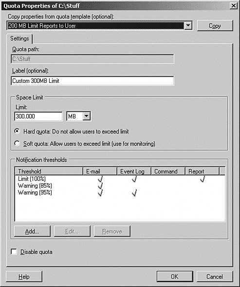 | | | 5. | This opens the Quota Properties dialog box, as shown in Figure 13.18. Enter the desired Space Limits, and then click the OK button.