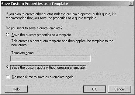 | 7. | When the Save Custom Properties as a Template dialog box appears, as shown in Figure 13.19, select the Save the Custom Quota Without Creating a Template option button, and then click the OK button.