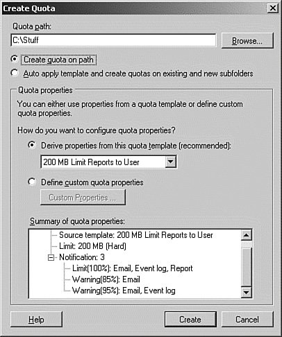 Figure 13.18. The properties dialog box allows you to configure space limits and notifications.  | 6. | On the Create Quota dialog box, click the Create button to save your quota.