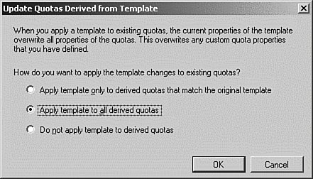 | 5. | The Update Quotas Derived from Template dialog box opens, as shown in Figure 13.25. Select the Apply Template to All Derived Quotas option, and then click the OK button.