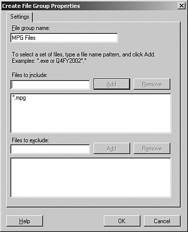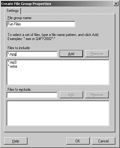 Figure 13.27. Enter the extensions of the files to block.  | 5. | Enter a name for the File group, and then enter the extensions of the files to block, using the format *.mp3. Click the Add button to add the file to the list.